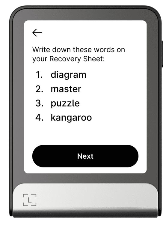 从盒子中取出空白的助记词回复卡片,点选「设定为新的Ledger」,阅读说明,然后点选「我明白了」。依序写下每个单字,直到您拥有全部24 个单字,然后开始确认流程并选择请求的单字以验证一切是否正确。