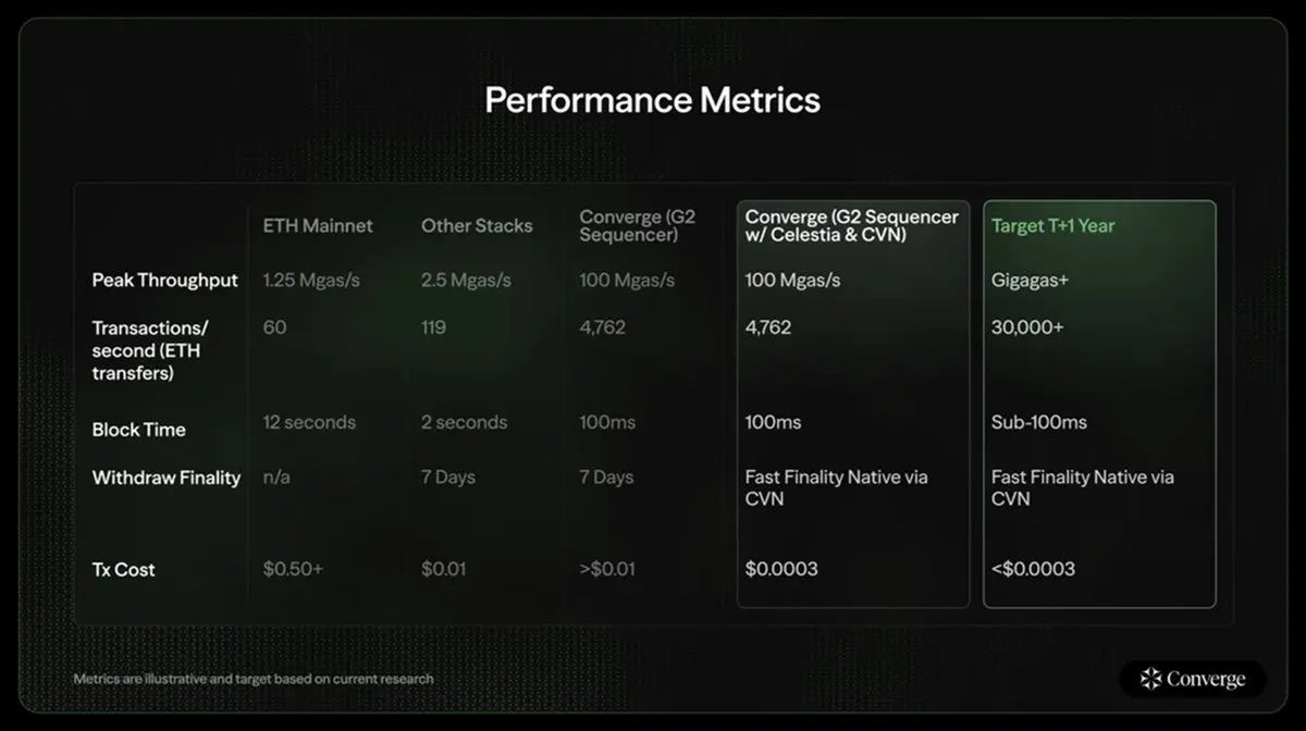 - 核心技术:执行层使用Arbitrum,资料可用性由Celestia 提供。采用Conduit 驱动的自定义G2 排序器,区块时间目标为100 毫秒,并计划实现GigaGas+ 吞吐。
