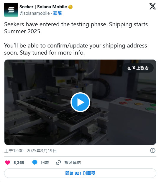 2025 年8 月4 日,Solana Mobile 正式宣布第二代Web3 智慧型手机Seeker出货,这款被许多社群称为「Solana 手机二代」的装置,将运往全球超过50 个国家,包括台湾在内的地区也能收到货。