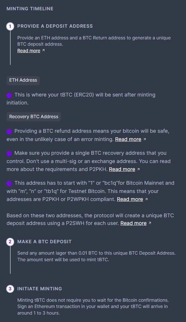 - BTC 回收地址(Recovery Address):作为备援退款地址,万一铸造过程中发生错误,系统会将BTC 退回到这个地址。