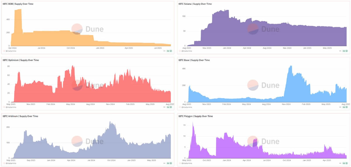 另一个DUNE 仪表板甚至提供了几条链上的tBTC 供应量趋势。