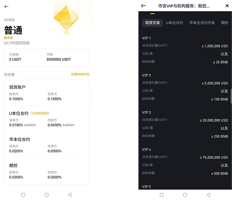 币安交易所不同服务手续费不同,而且持有BNB,可选择使用BNB抵扣交易手续费,来看看币安交易所的手续费情况。