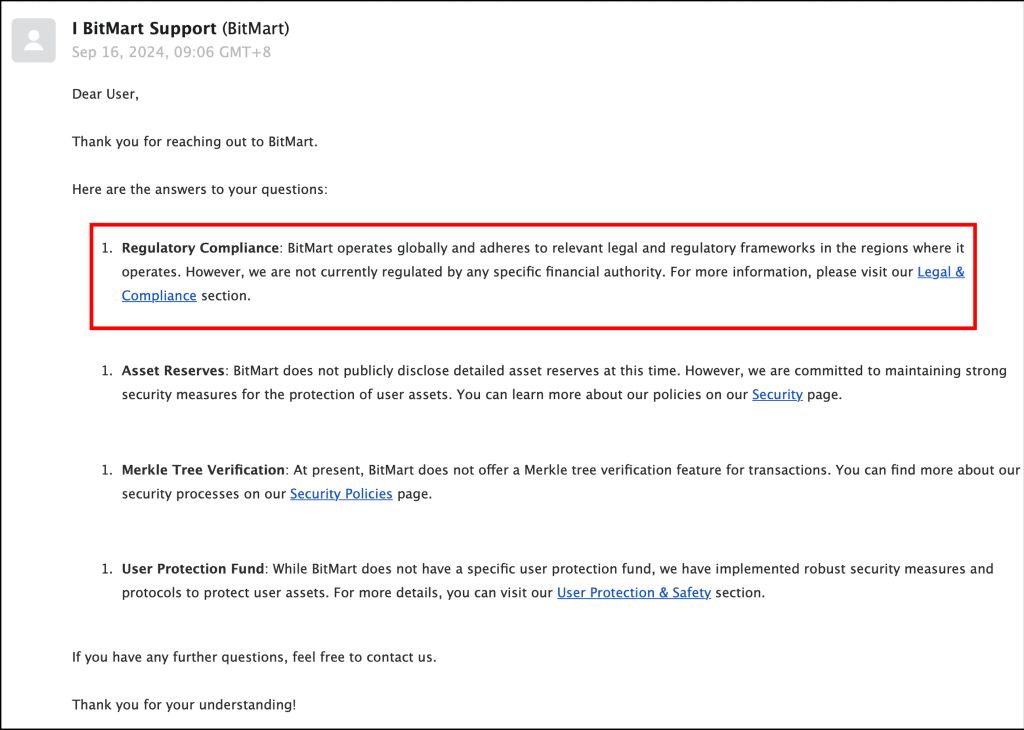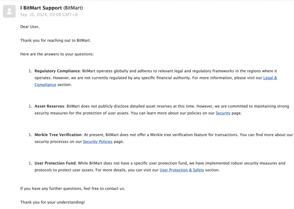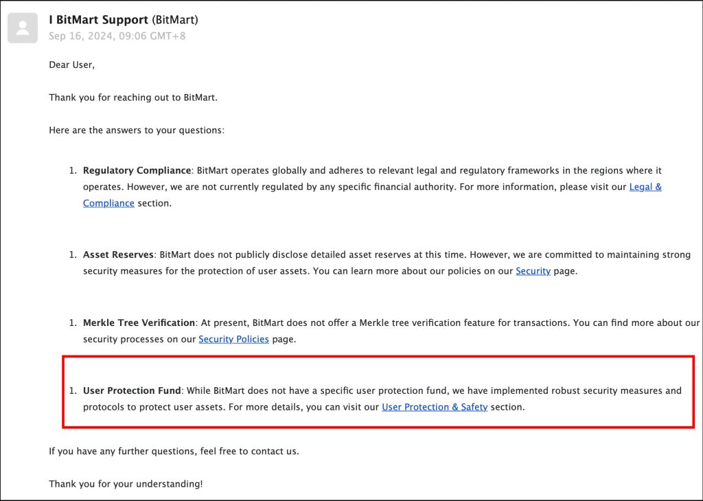 - BitMart 目前没有用户保障基金