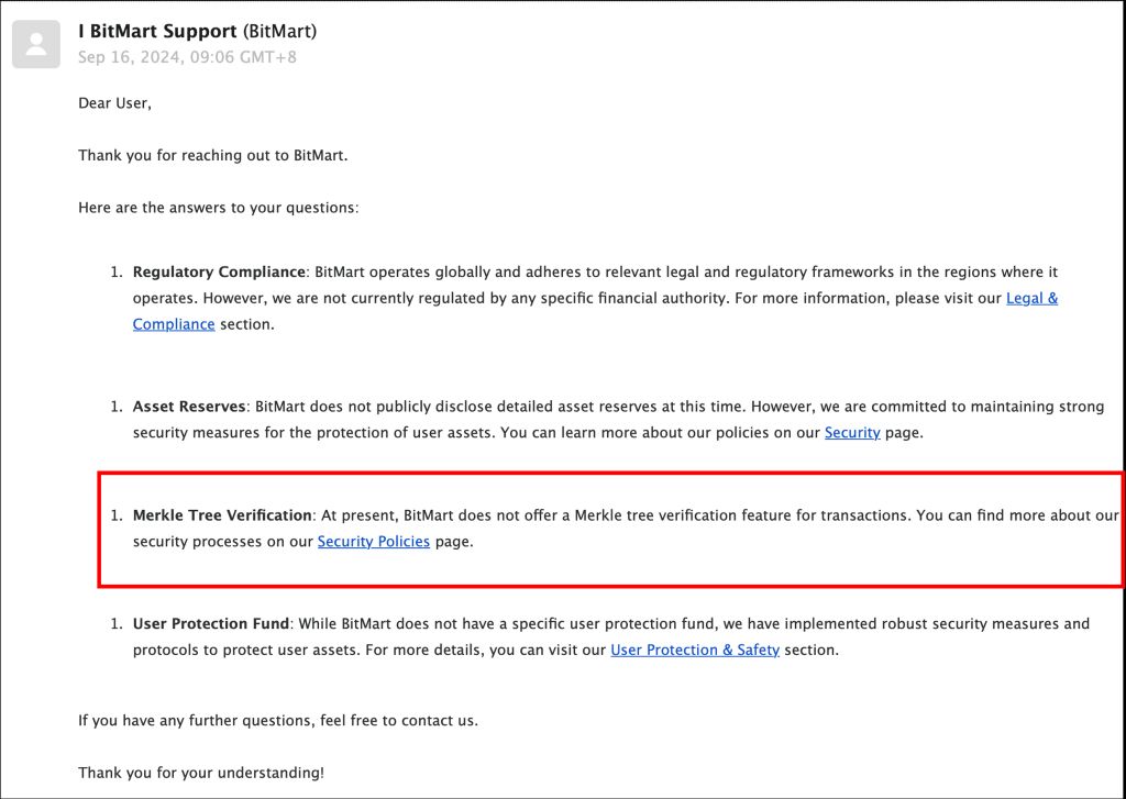 但BitMart 没有获得金融监管、也没有提供用户保障基金、没有默克尔树验证!