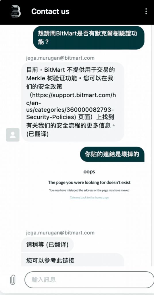 BitMart 支援7*24 线上客服,但需要和机器人交谈后,才能转接给真人客服,也能提交问题表单给BitMart ,客服会再回信。