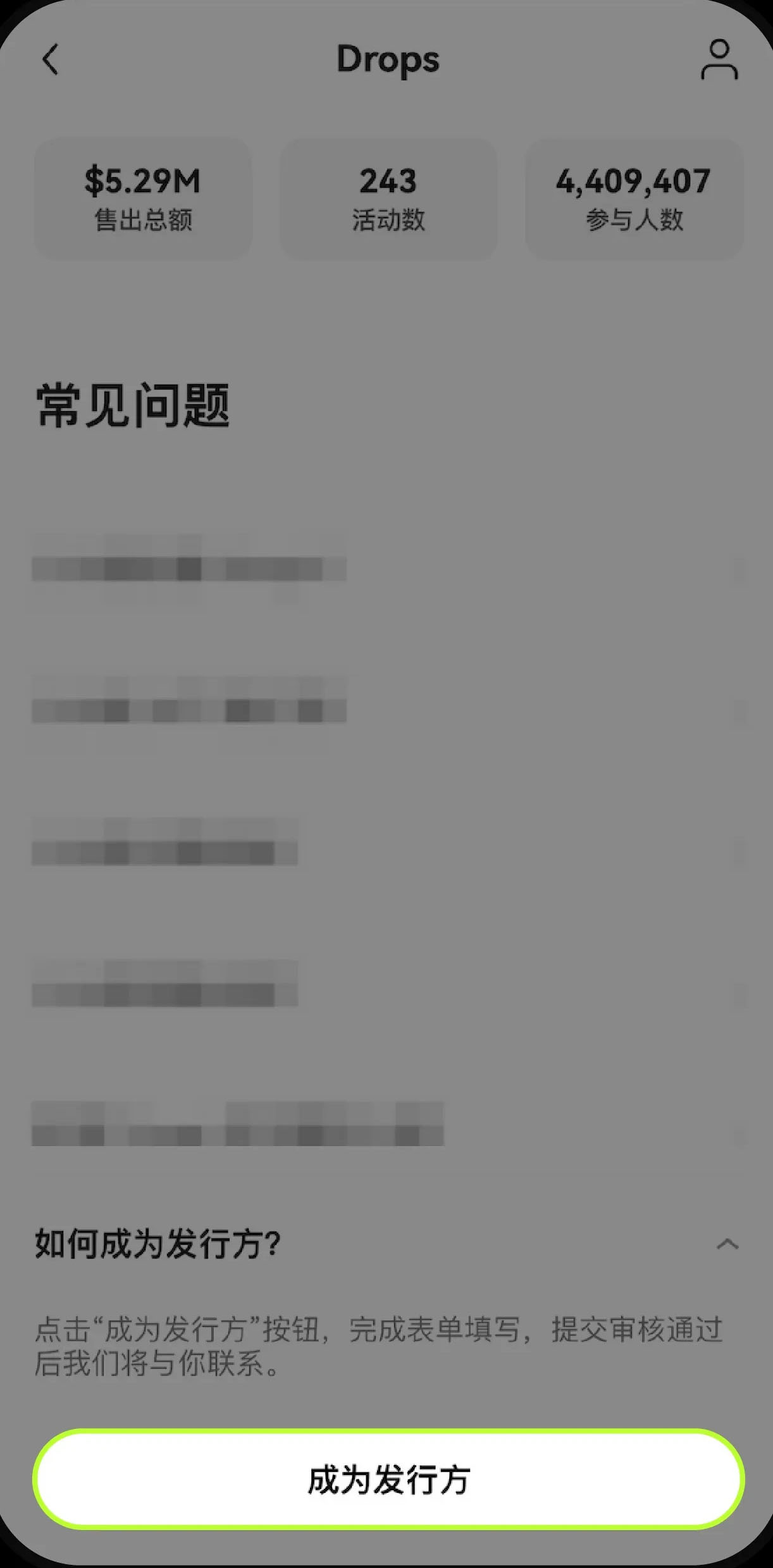 在Web3钱包的【掉落】页面,下拉至“常见问题”的部分-找到“如何成为发行方”,并按界面需求填写资料即可。
