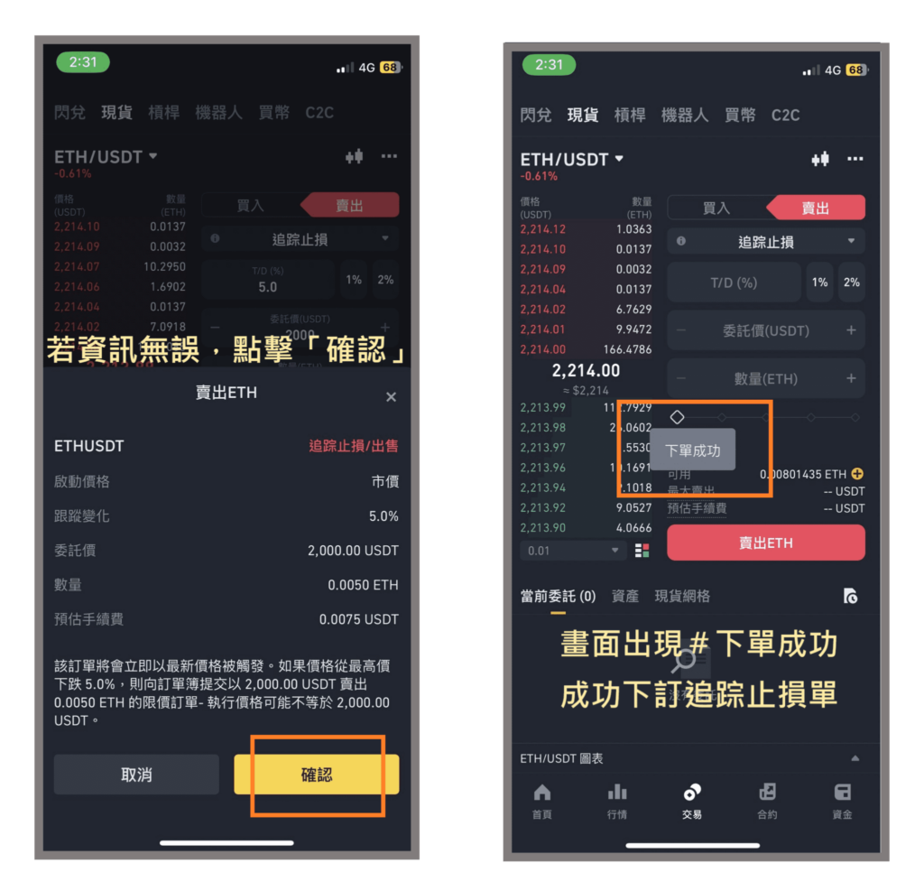 订单的内容会包含「启动价格、追踪变化、委托价、数量、发票手续费」,请再次确认资讯,没问题的话就可以点击「确认」。