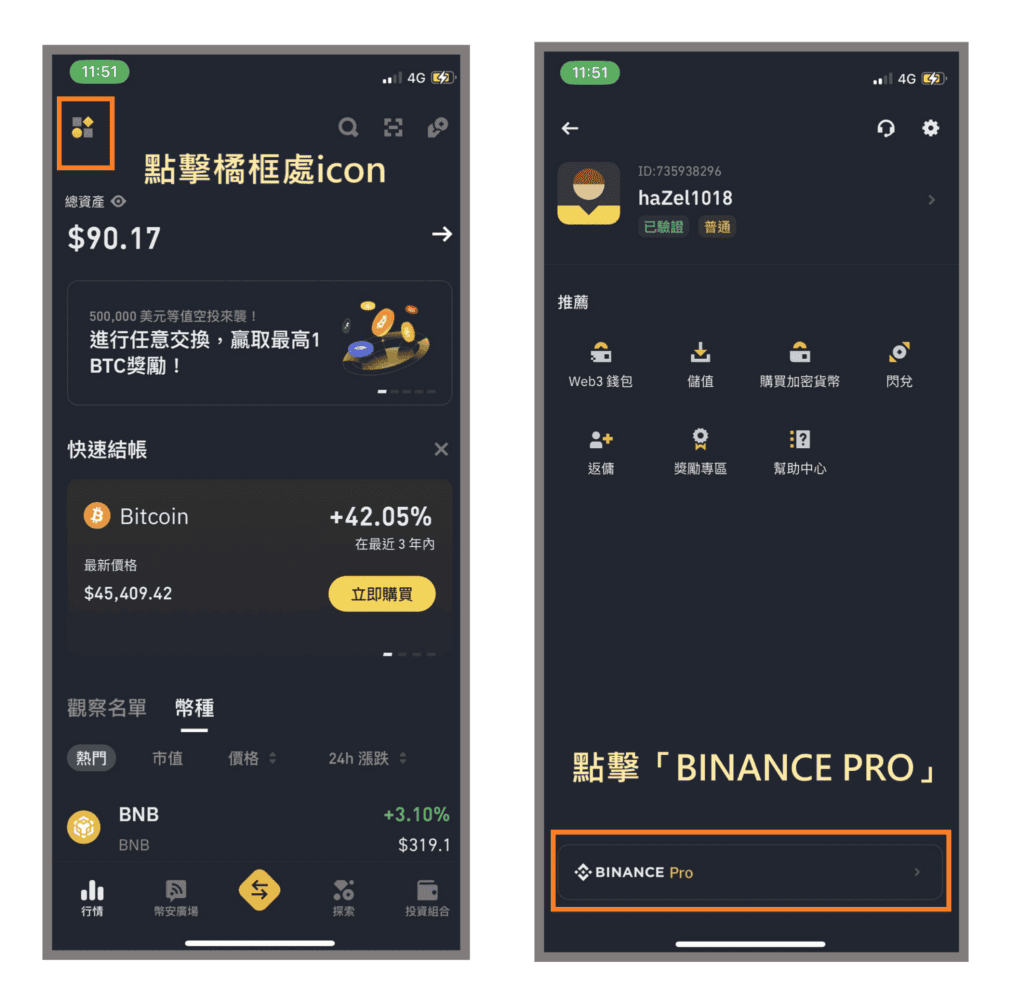 OK,我们可以开始实操了,以下的教学都会使用币安app的pro版本进行示范,Lite版本可以点击App左上角的头像图标进行切换:)。