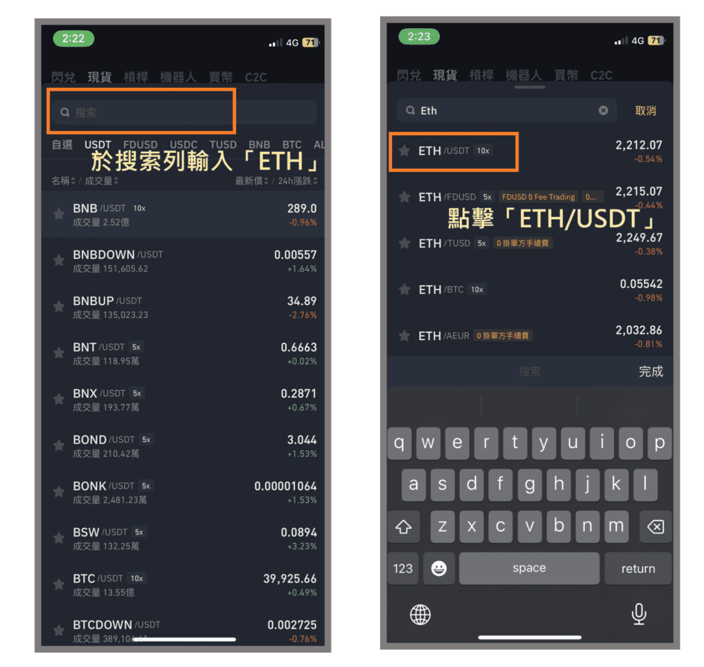 Step② 输入「ETH」,进入 ETH/USDT 的交易介面