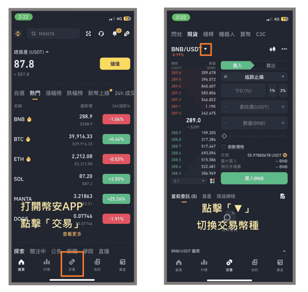 点选币安App正中央下方的「交易」按钮,然后在左上角的交易对旁点击橘框处「▼」,就可以切换交易币种。