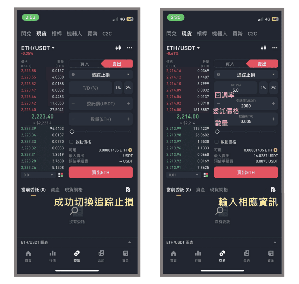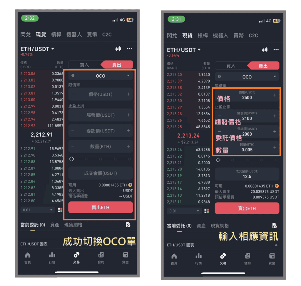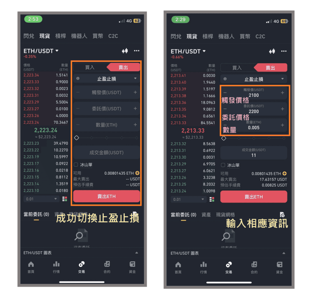 那我夹填触发价2,200,委托价格2,100,数量0.005,意思就是「若ETH持续下探,待跌至2,200触发(触发),请帮我卖出0.005张价格2,100的ETH」。