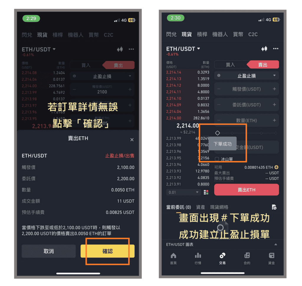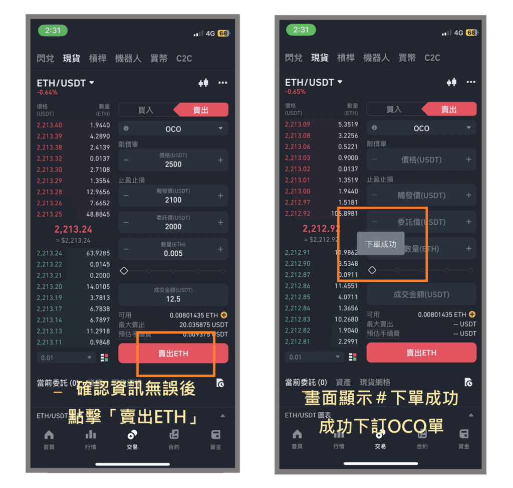 按「卖出ETH」后,交易市场介面会跳出显示「下单成功」的框框,就代表我们成功下订OCO单啰。