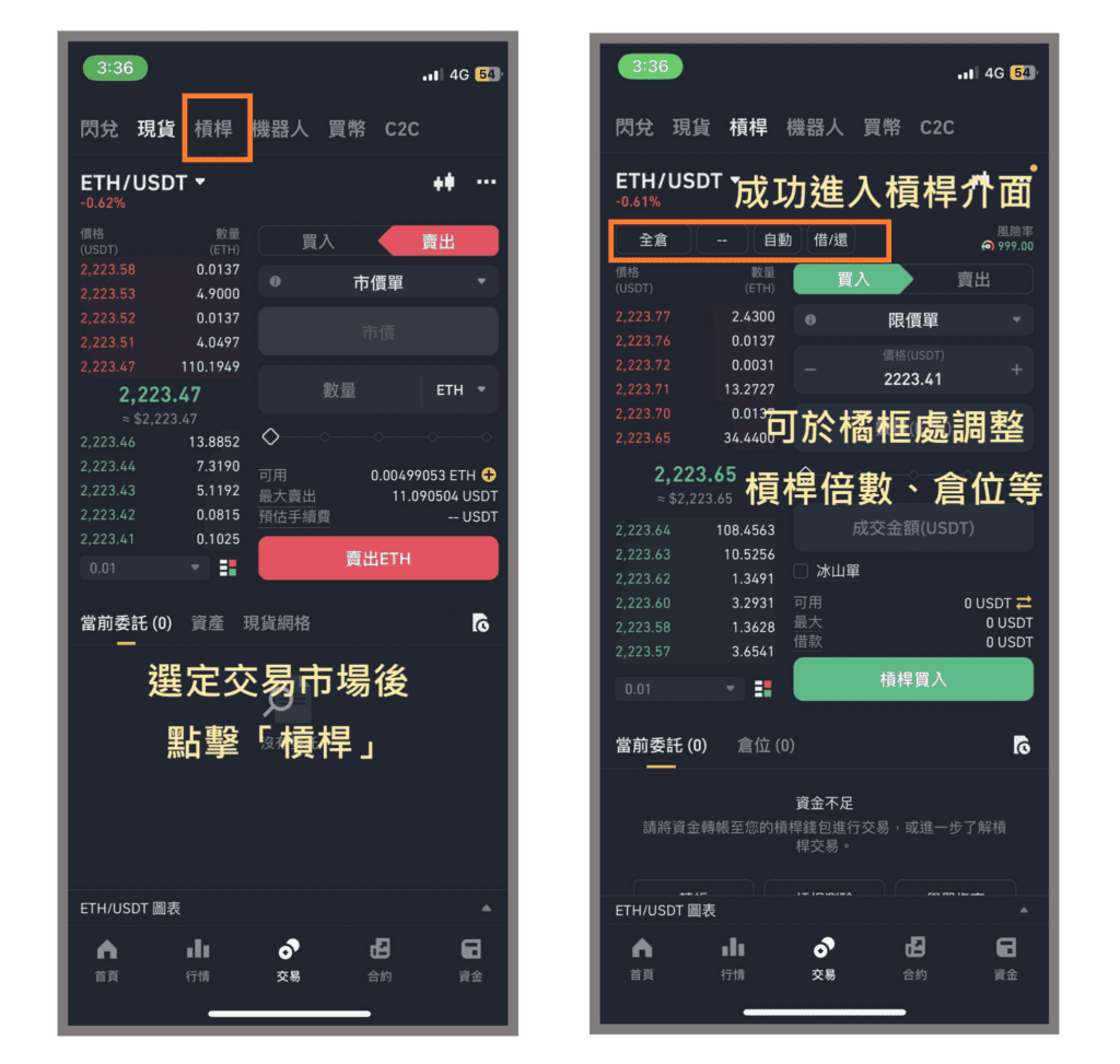 切换至干杆行情后,可在橘框处调整仓位(全仓或逐仓),杠杆倍数(1~10倍),自动还款记账等相关设定。