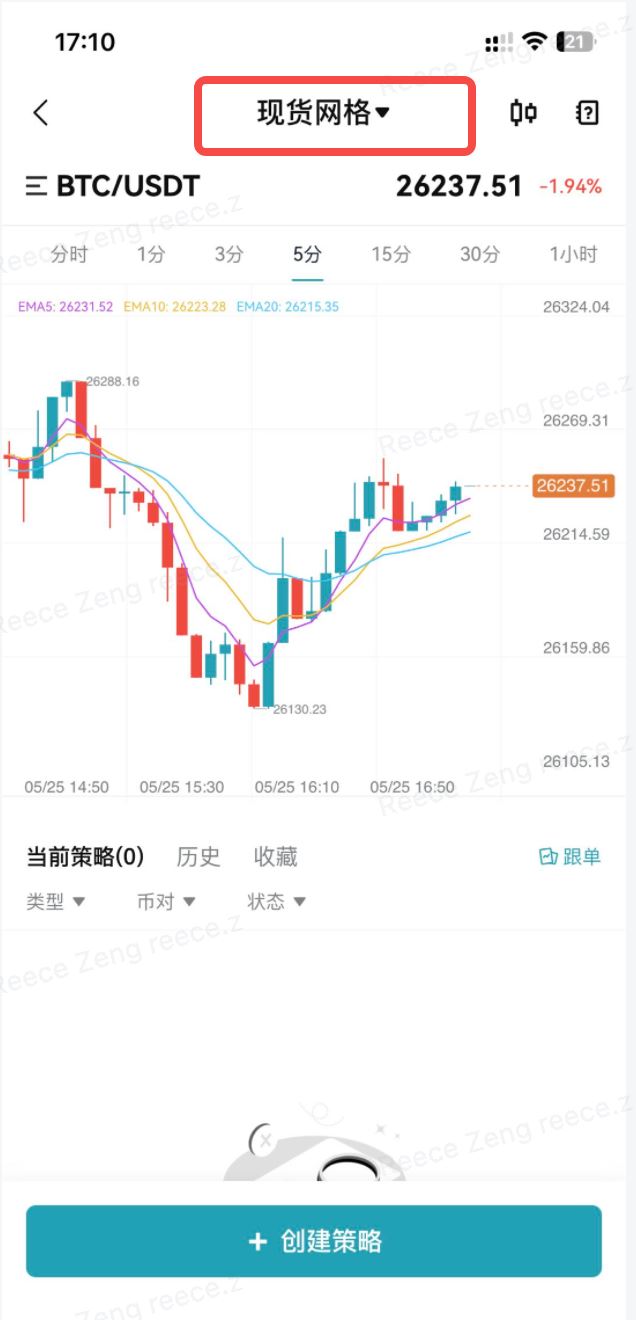 访问【策略清单】,点击【现货网格】,并选择您偏好的币对,例: BTC/USDT。