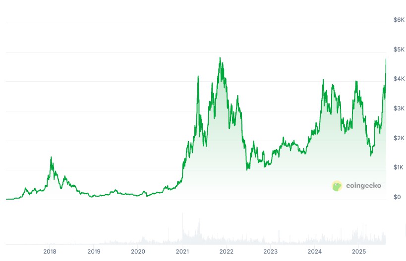 自2017年1月以来的以太坊(ETH)价格图表。来源:CoinGecko