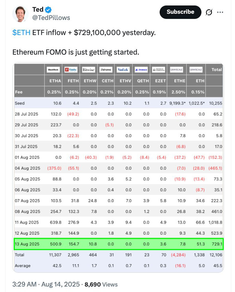 在周四的一篇X帖子中,针对现货以太坊ETF的7.29亿美元流入,加密市场观察家Ted PIllows表示,“以太坊FOMO才刚刚开始”。