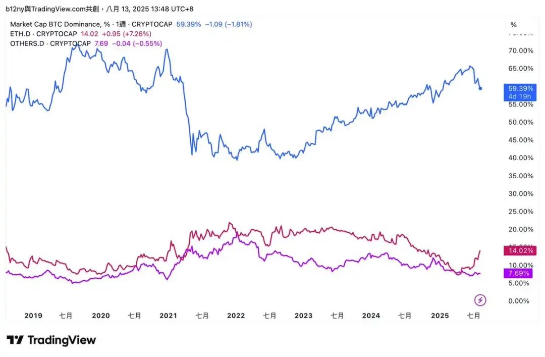 BTC.D 近期呈现明显的下降趋势,已从前期高点回落至约 57.7%。结合 ETH.D 的走势,我认为这是一个典型的资金轮动信号:市场资金开始从相对稳健的资产撤出,转而追求更高风险、更高潜在回报的标的。回顾历史,BTC.D 的持续走低,往往是山寨季启动的必要条件之一。