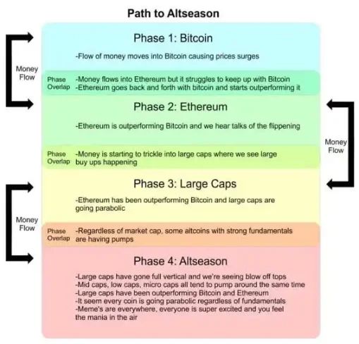 山寨季的启动流程一般如下所示,比特币(BTC)启动行情→ 以太坊(ETH)跟随上涨→ BTC 再次发力→ ETH 突破历史新高(ATH)→ 大市值山寨币上涨→ BTC 创下新高→ ETH 与大市值山寨币齐创新高→ 中市值山寨币起飞→ 小市值山寨币全面爆发