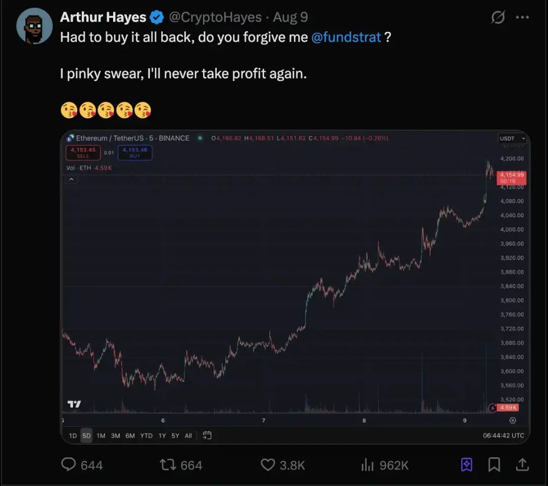 8 月 12 日,以太坊一举突破 4700 美元,创下四年来新高,上周提前获利了结的@CryptoHayes 也在 8 月 9 日重新买回以太坊;比特币也再创新高,加密货币总市值冲上 4.2 万亿美元,市场情绪被彻底点燃。