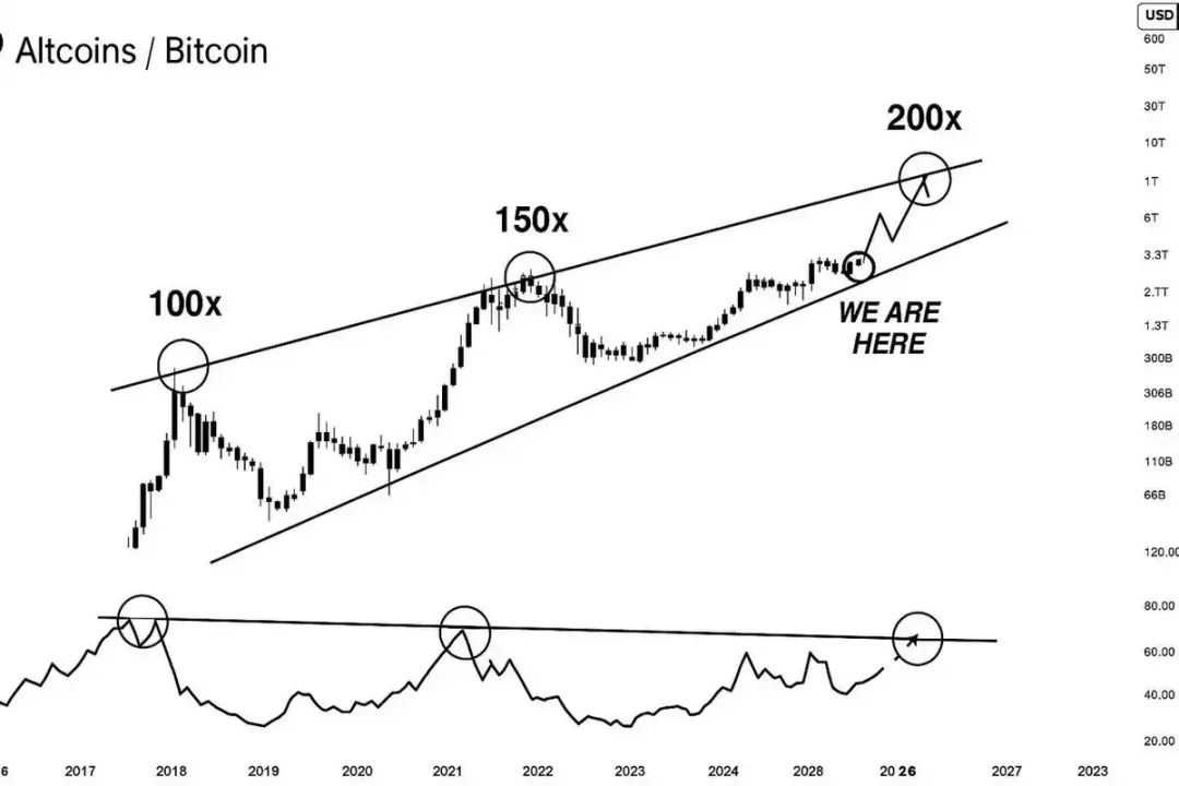 从 2017 年至今的山寨币与比特币市值对比来看,目前我们正处于通道下沿的关键支撑位置。这一位置历来是资金切入的敏感区间,往往伴随市场情绪回暖与轮动加速。若该支撑获得确认,山寨币板块有望迎来集体爆发,标志着新一轮山寨季的正式启动。