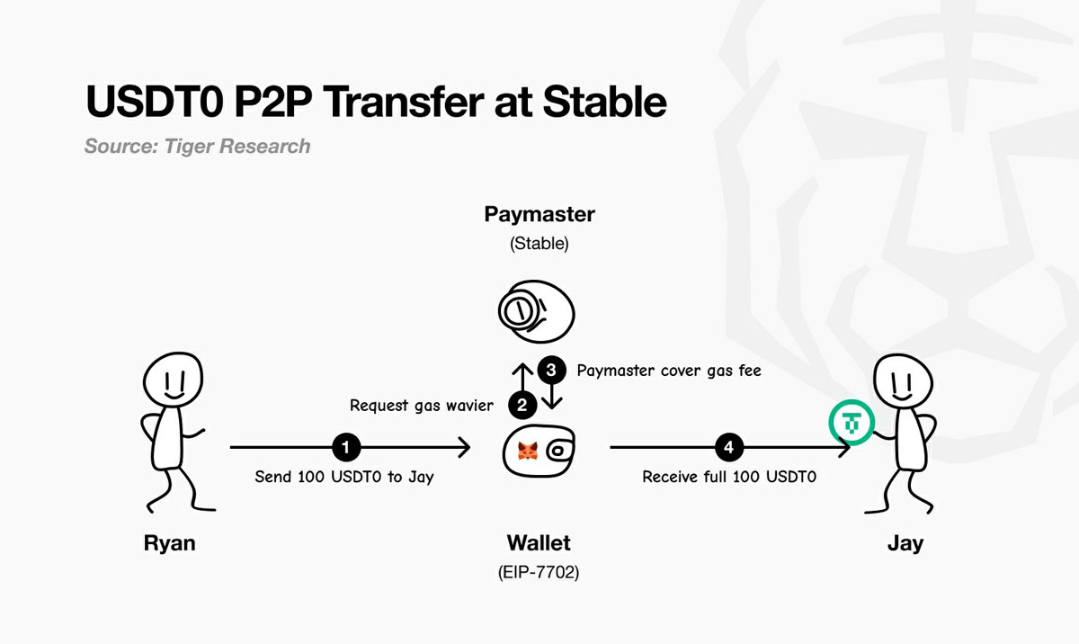 为实现无需手续费的 P2P 转账,Stable 利用了 EIP-7702 和账户抽象技术。其关键优势在于,用户只需持有 USDT0 即可进行所有交易。