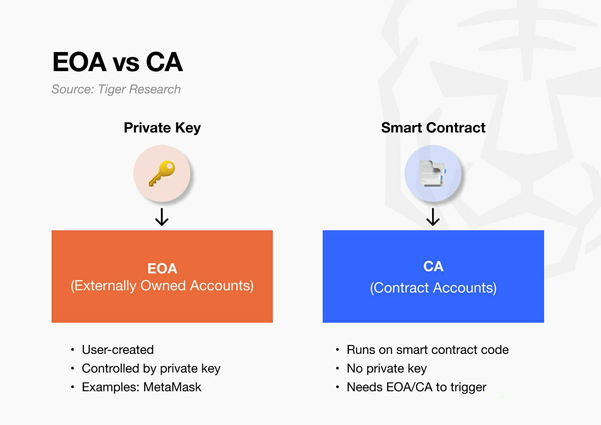 - 合约账户(CA):能够执行复杂逻辑但无法独立发起交易的智能合约。