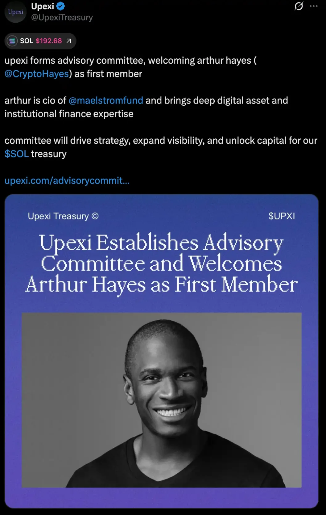 不过近期 Solona 方面的新动作正逐渐弥补这一缺陷。8 月 12 日,「SOL 微策略」Upexi 成立了全新的咨询委员会,并任命 Arthur Hayes 为首位成员。Hayes 是 BitMEX 的联合创始人、永续合约的开创者,曾在德意志银行与花旗集团担任交易员,如今掌舵数字资产投资基金 Maelstrom。他既有传统金融背景,又深谙加密市场结构,能够为机构融资与数字资产战略提供实战级的指导。