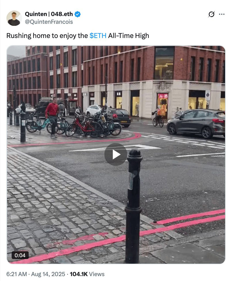 加密货币交易员Ardizor周四表示,以太坊"将在几天内创下历史新高"。就在一周前,加密货币交易员Pentoshi在8月7日表示,"很可能在不久的将来创下新的历史高点"。