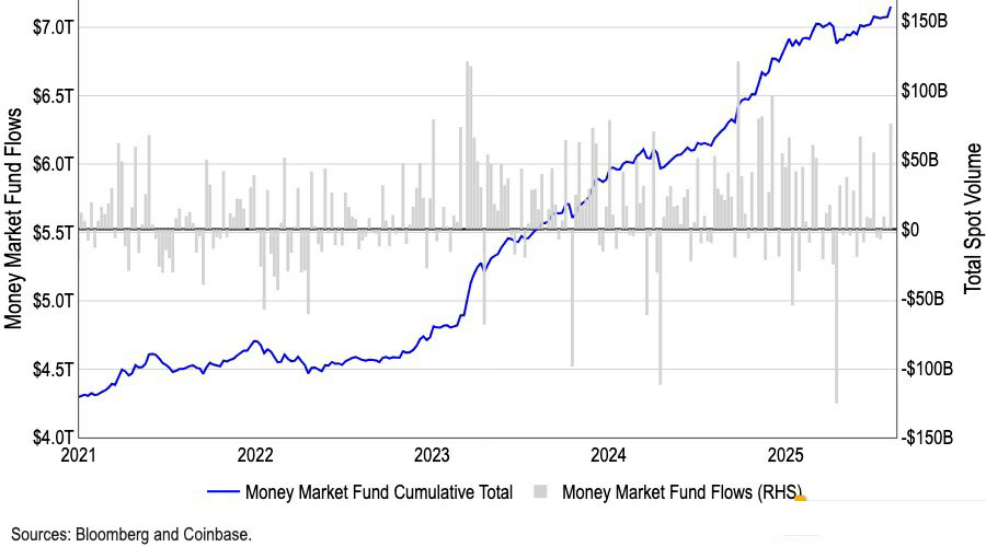 - 许多人争论美联储9月份的降息是否意味着加密货币市场局部触顶。Coinbase认为并非如此。鉴于大量散户资本在货币市场基金(超过7万亿美元)和其他领域处于观望状态,Coinbase认为美联储的宽松政策可能会在中期内释放更多散户参与的潜力。
