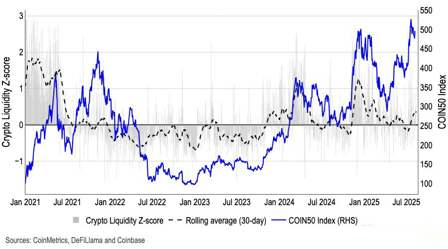 事实上,我们基于稳定币净发行量、现货和永续合约交易量、订单簿深度以及自由流通量等因素,对加密货币流动性进行加权的z值测量,表明近几周流动性在经历了六个月的下滑后已开始回升。(见图3。)稳定币的增长部分得益于这些资产的监管环境更加清晰。
