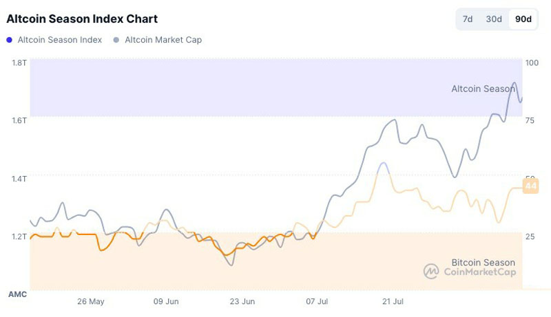 CoinMarketCap的山寨币季指数(ALTCoin Season Index)目前为44,远低于其历史上定义山寨币季的门槛75点。