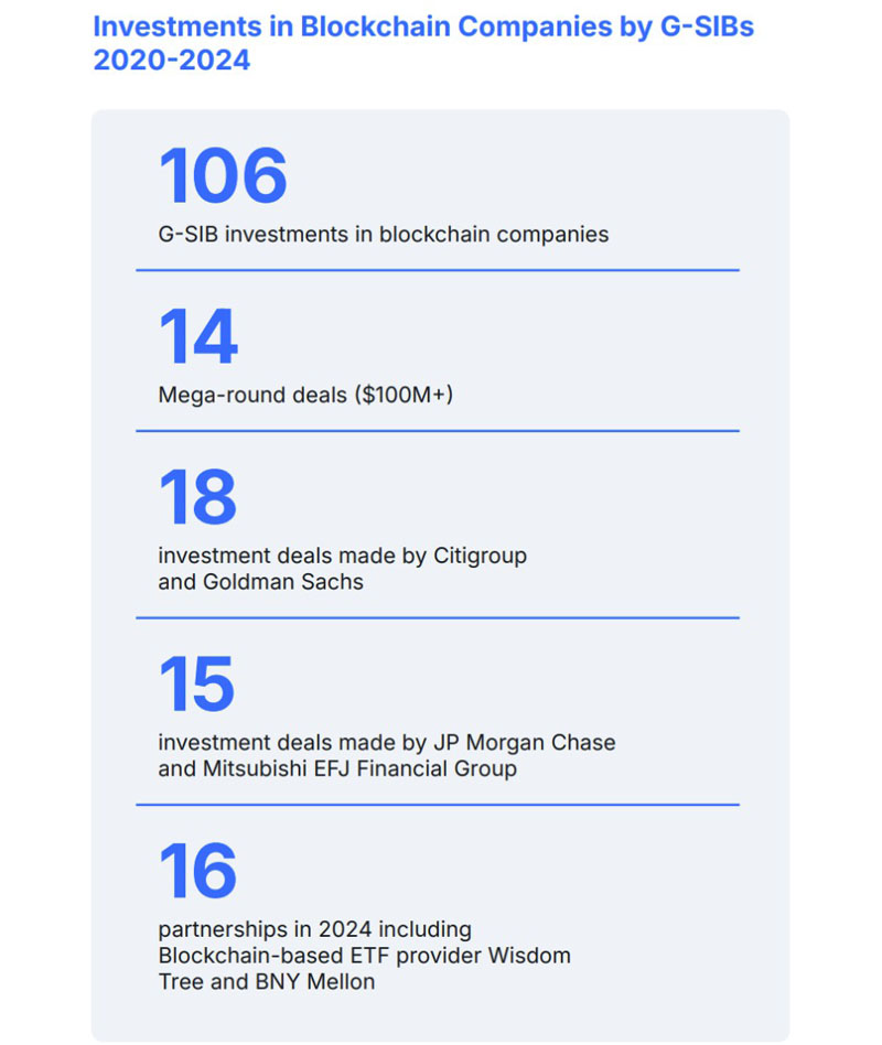 Ripple、CB Insights和英国区块链技术中心最近发布的一份报告将花旗集团列为区块链公司最活跃的机构投资者之一,在2020年至2024年间进行了18笔交易。