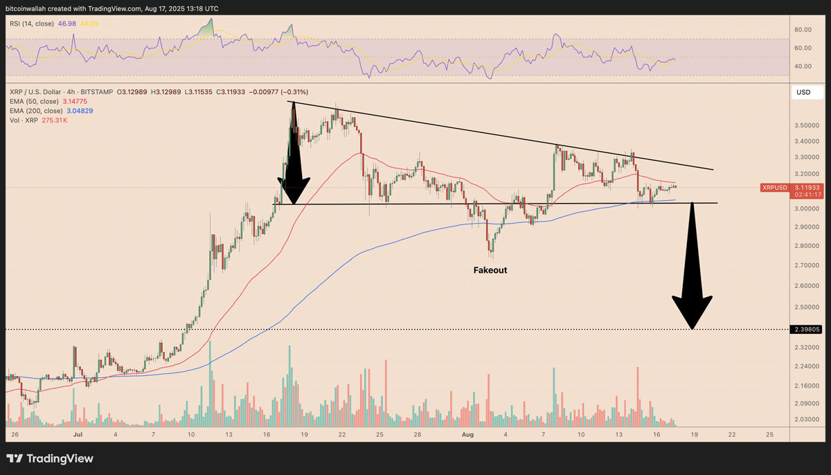 该形态的典型特征是高点逐步降低,同时在3.05美元附近形成水平支撑。本月早些时候,XRP曾短暂跌破该支撑位出现假突破,随后又回升至该结构内部。