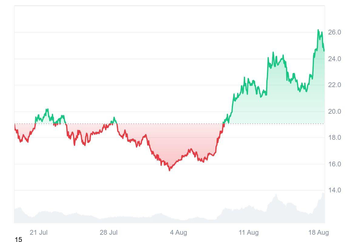 Chainlink (LINK) 本周飙升至 26 美元以上,创下约 18 个月以来的最高水平,成为头条新闻。这一走势使 LINK 成为表现最佳的大型加密货币之一,并以两位数的日涨幅跑赢大部分市场。对于投资者来说,现在最大的问题是,这轮上涨是否有足够的动能推动该代币突破 30 美元的重要心理关口——这是自 2022 年初以来从未见过的价格点。