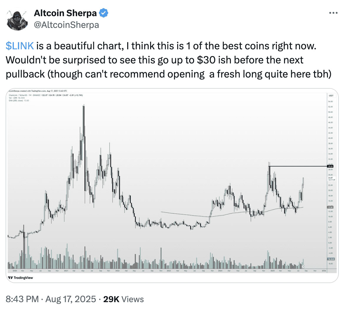 像 Altcoin Sherpa 这样的知名人士称 LINK 是“目前最好的加密货币之一”,但他们也警告称,30 美元的水平可能成为一个重要的阻力位,一些投资者可能会在此获利了结。尽管如此,这种热情仍然得到了有力数据的支持:LINK 的日交易量在过去 24 小时内飙升了 60% 以上,这证实了新资金正在流入,而不仅仅是炒作。