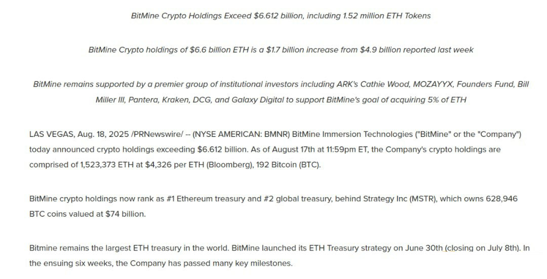以 BitMine 为例,据官方披露,其加密资产持有量已超过 66.12 亿美元,相比此前一周的 49 亿美元增加了约 17 亿美元,其中 BitMine 持有 152.3 万枚 ETH(按当前每枚 4,326 美元计算),同时也持有 192 枚 BTC。