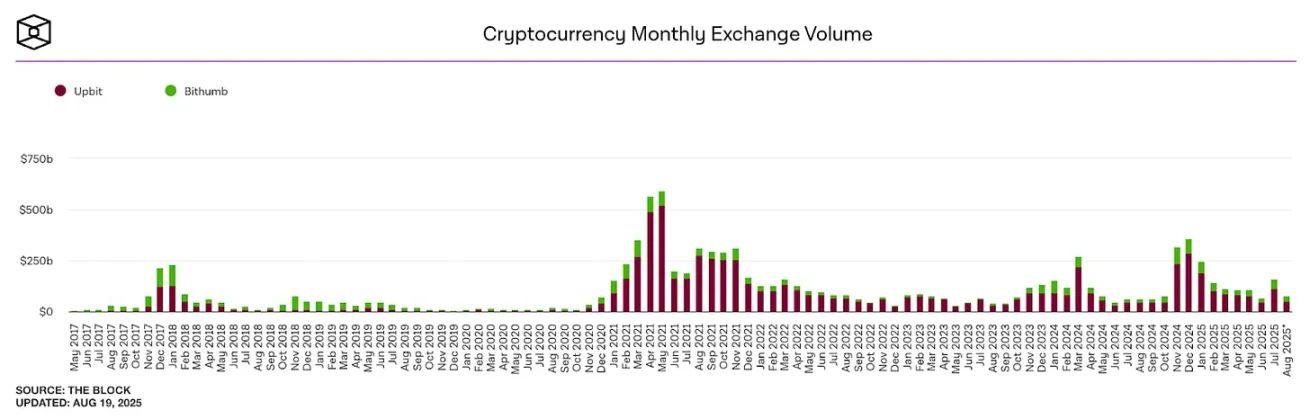 韩国在全球加密货币市场中占据独特地位。以法币为基准,韩元(KRW)交易量仅次于美元(USD),位居全球第二,有时甚至超过美元。仅凭单一国家的用户就能产生如此大的交易量是极为罕见的。得益于这样的市场环境,Upbit 和 Bithumb 得以成长为资产总额超过 5 万亿韩元的大企业。