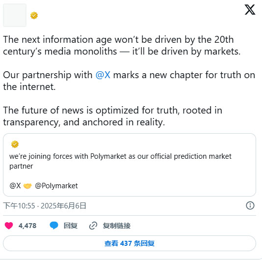 PolyMarket 称此举「标志着互联网真相的新篇章」,新闻的未来将由市场而非媒体主导。 X 则表示,透过这项合作,平台用户能取得更透明、即时、具参与感的公共事件资讯。
