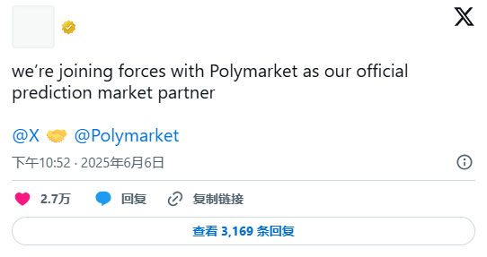 除了平台本身的成长,PolyMarket 近期最受瞩目的消息,莫过于2025 年6 月正式与社群媒体平台X(原Twitter)结盟,成为其官方预测市场合作伙伴。