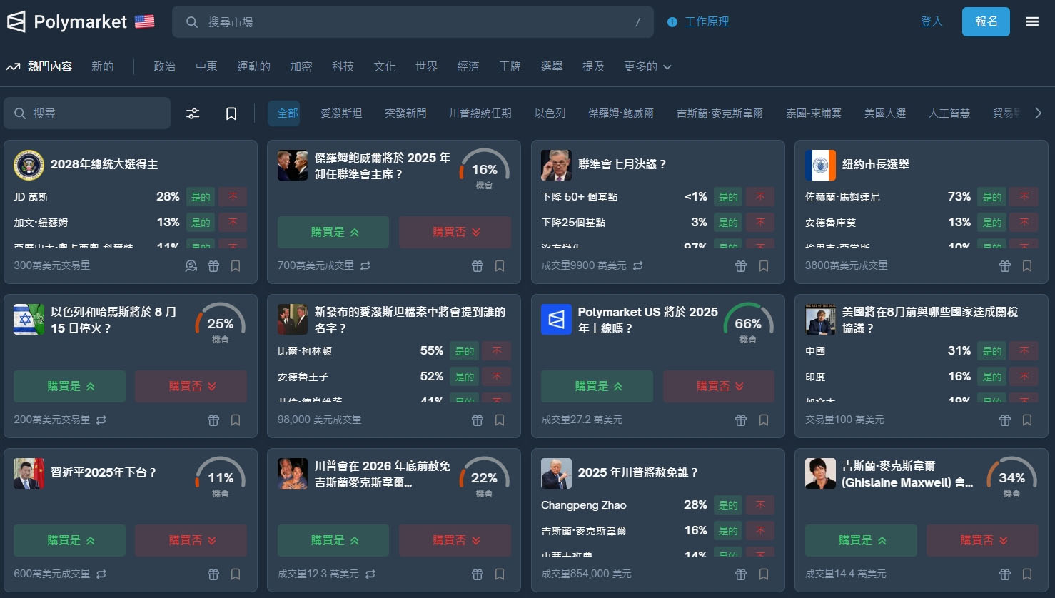 截至2025 年中,PolyMarket 上热门的预测事件类型包括: