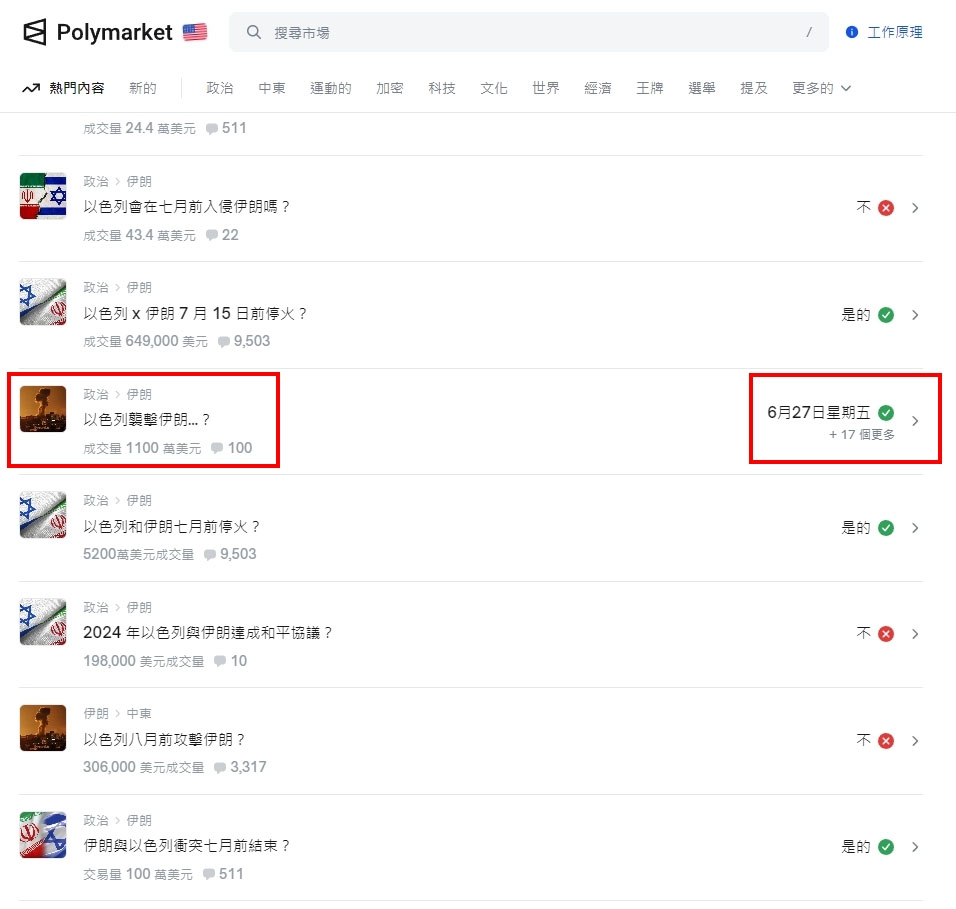 以2025 年6 月的以色列与伊朗局势为例,PolyMarket 上针对「是否发动军事攻击」的事件一度吸引数千万美元的参与资金,最终市场机率达88%,结果也与实际发展相符。