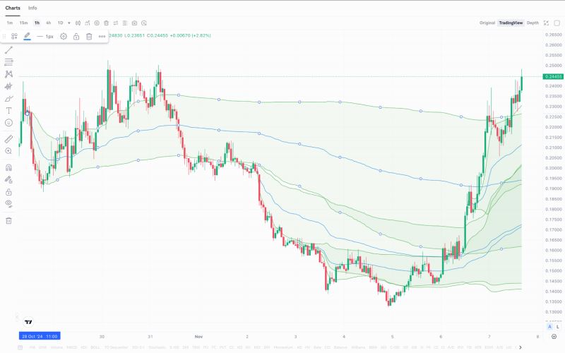 使用锚定成交量加权平均价格(Anchored VWAP),交易者通常会在图表上的关键位置(如价格高点或低点)锚定曲线,从而更好地分析支撑位和阻力位。在Gate.io等平台上,用户无需手动计算,只需在所选代币的交易图表中打开“投影指标”,选择锚定成交量加权平均价格(Anchored VWAP)并设置时间范围,即可生成分析曲线。