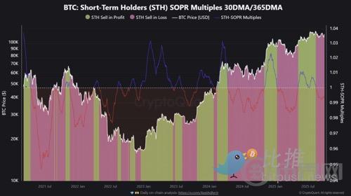 根据Glassnode数据,短期持币者实现价值比(STH-RVT)自5月以来持续收缩,表明短线投机行为降温,市场进入“健康积累期”。