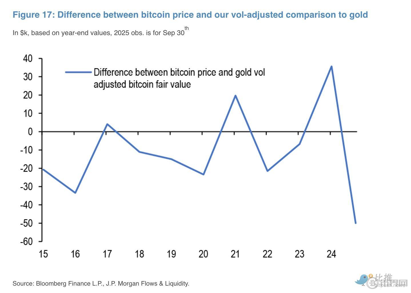 报告作者、摩根大通董事总经理Nikolaos Panigirtzoglou指出:“自2024年底以来,估值缺口已从比特币高估3.6万美元,转为低估4.6万美元。”
