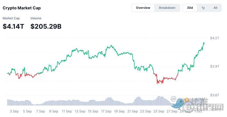 这一轮轧空行情几乎席卷整个市场,百大加密货币悉数上涨。整体加密货币总市值自9月底以来上涨超过6%,在10月2日突破4.14万亿美元,创下自8月中旬以来的新高。