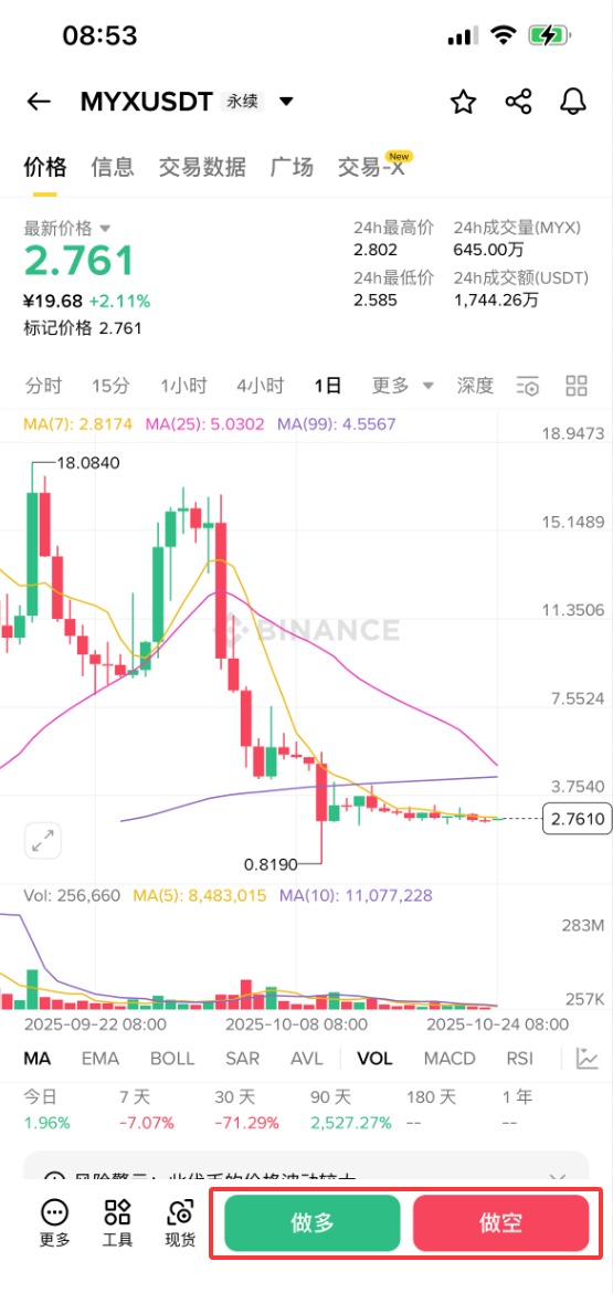 币安提供MYX永续合约交易对,MYXUSDT合约杠杆为1-20。