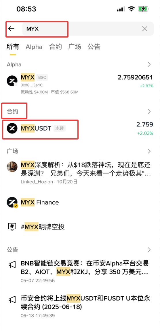 3、输入【MYX】,这时下拉会显示合约MYX usdt,点击【MYXUSDT】。