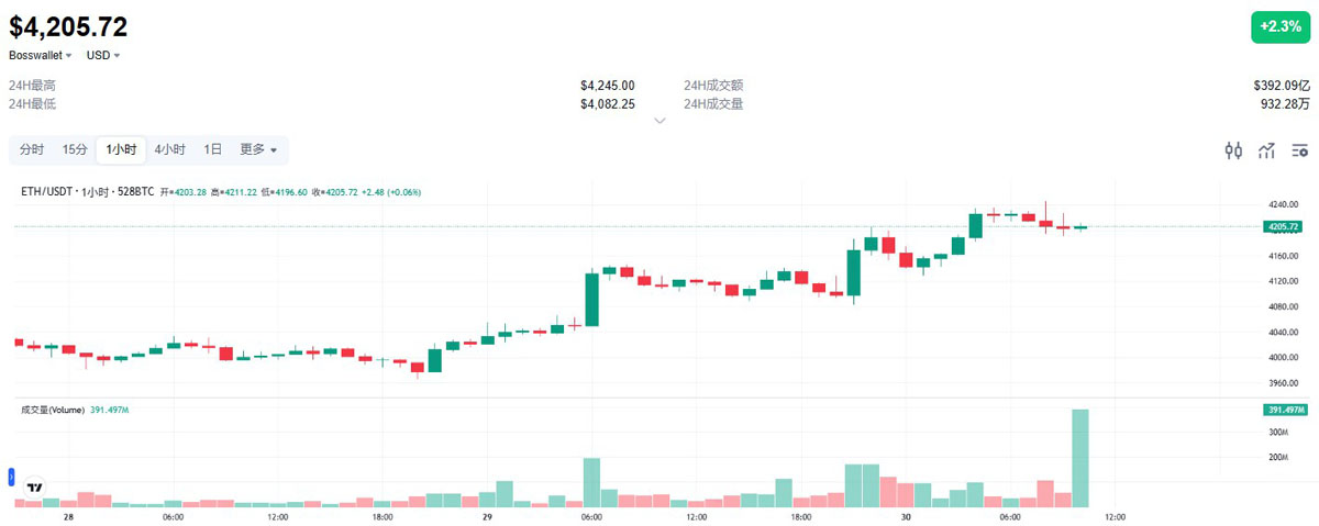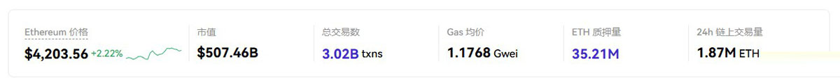 以太坊价格重回4200美元大关,最高触及4280美元,一改近期低迷走势。