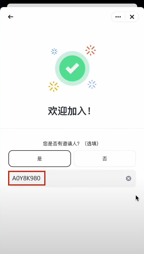 你也可以自己直接使用APP来进行注册,只要在填写邀请人的时候,把这个邀请码填写进去,你也同样能够享受20%的返佣率,和使用邀请链接是一样的。