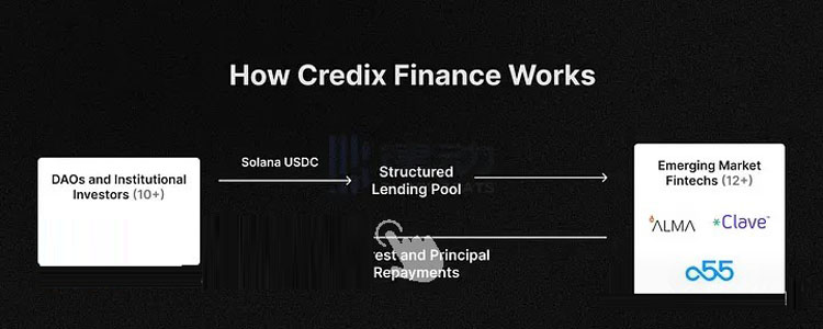 Credix FinanceCredix Finance 于 2021 年创立,专注于私人信贷类 RWA 。Credix 的逻辑比较简单,可视为一个链上与现实之间的借贷中介平台:向链上用户借来 USDC,再转换为各国本地货币,贷给各种类型的借款实体,并向链上用户提供借贷收益。